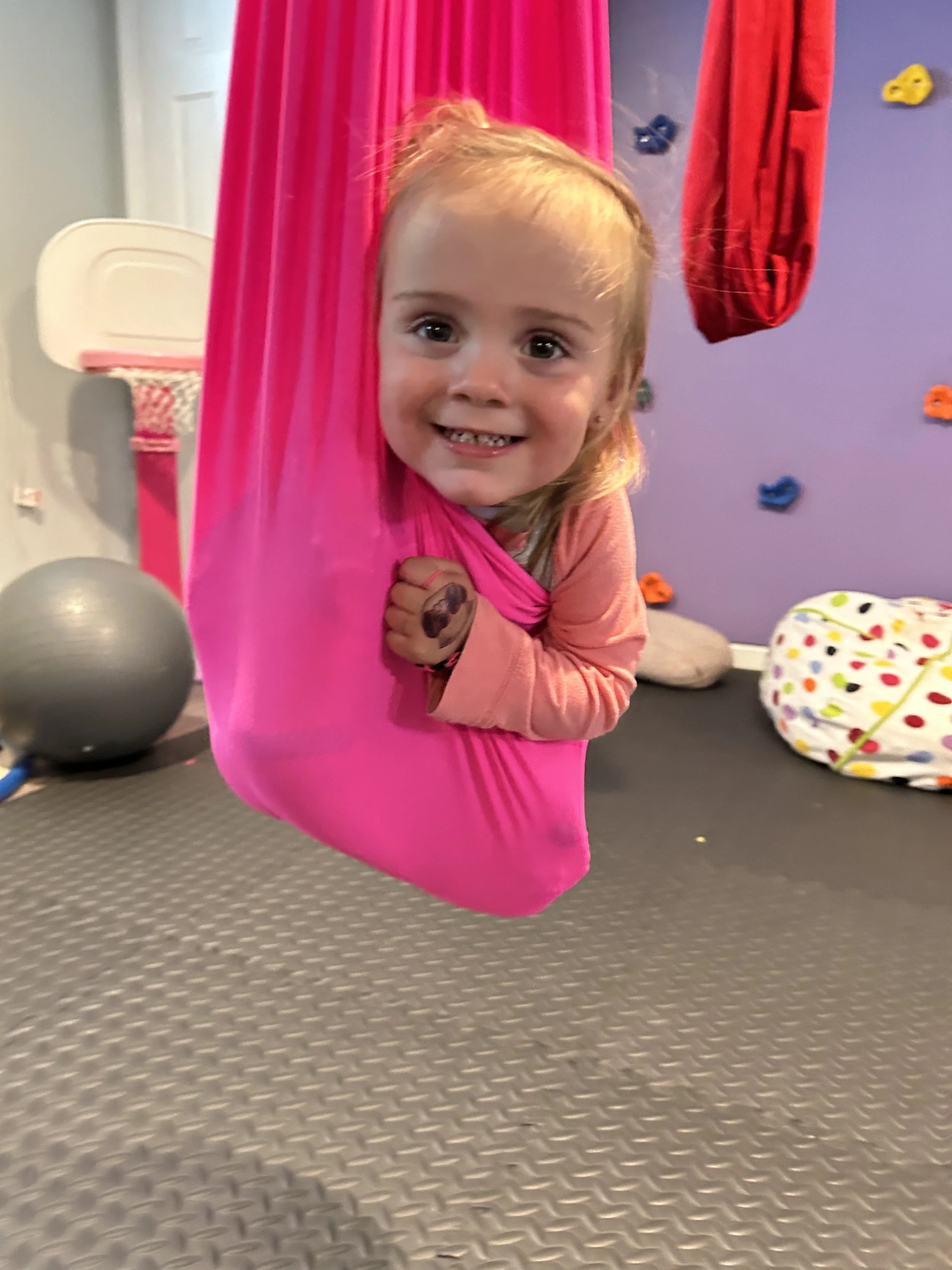 A kiddo enjoying some vestibular input in a lycra swing in the clinic